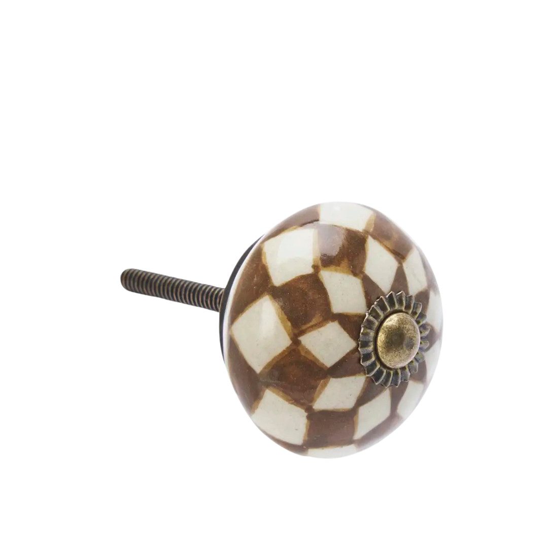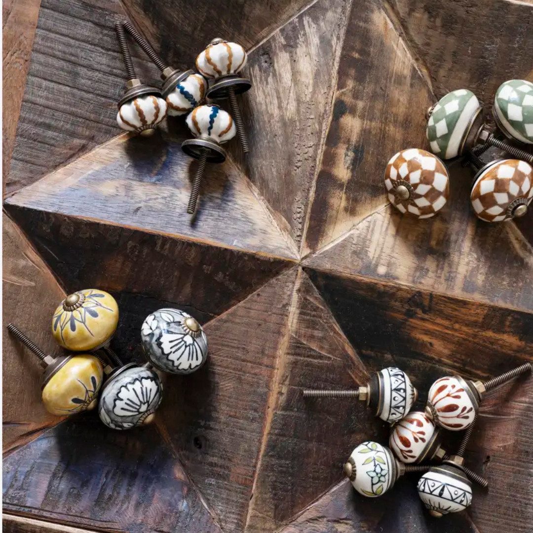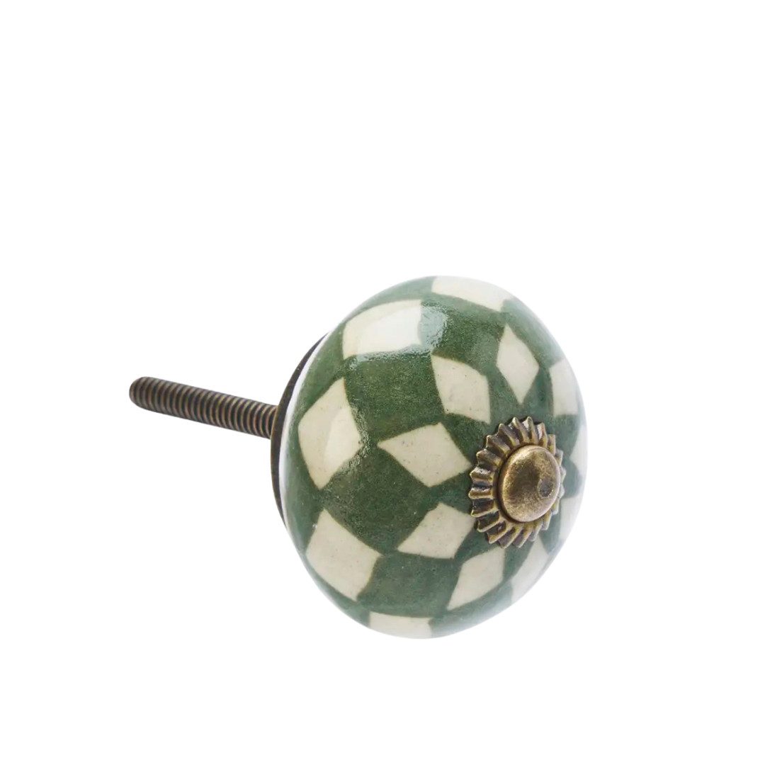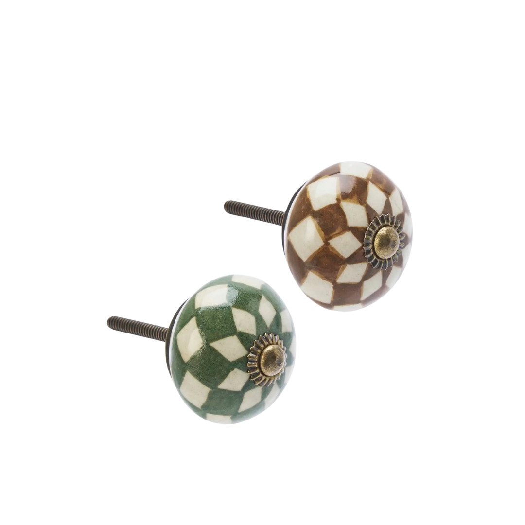Crafted in India from stoneware and iron, this hand-painted doorknob set features off-white, green, brown, and antique brass accents. Ideal for drawers, cabinets, or small doors, each knob adds a unique, artisanal touch while complementing a variety of interior styles.